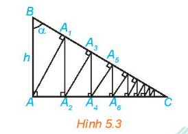 Câu hỏi: Cho tam giác vuông ABC vuông tại A, có AB = h và góc B bằng \(\alpha \) (H.5.3). Từ A kẻ \(A{A_1} \bot BC\), từ \({A_1}\) kẻ \({A_1}{A_2} \bot AC\), sau đó lại kẻ \({A_2}{A_3} \bot BC\). Tiếp tục quá trình trên, ta được đường gấp khúc vô hạn \(A{A_1}{A_2}{A_3} \ldots \) Tính độ dài đường gấp khúc này theo h và \(\alpha \)