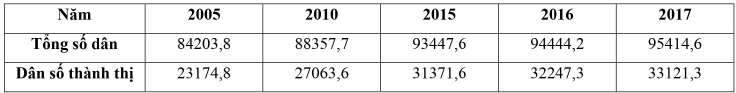(Nguồn: Niên giám thống kê Việt Nam 2017, NXB Thống kê, 2018) Theo bảng số liệu, nhận xét nào sau đây không đúng về tổng số dân và dân số thành thị của nước ta giai đoạn 2005-2017?