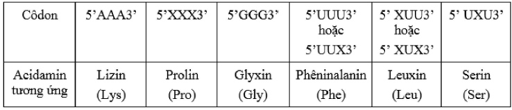 Câu hỏi: Cho biết các côđon mã hóa các axit amin tương ứng trong bảng sau: