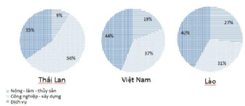 Dựa vào biểu đồ đã cho, tỉ trọng khu vực công nghiệp - xây dựng của Thái Lan là 56%, cao nhất trong 3 nước.