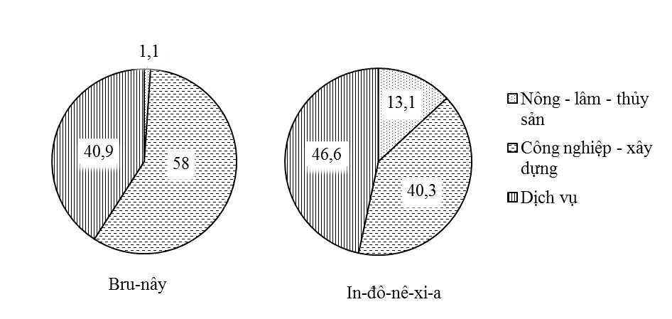 Theo biểu đồ, nhận xét nào sau đây đúng khi so sánh tỉ trọng các ngành trong cơ cấu GDP của Bru-nây và In-đô-nê-xi-a, năm 2017?A. Nông - lâm - thủy sản của Bru-nây cao hơn.