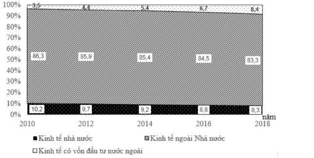 Theo biểu đồ, nhận xét nào sau đây đúng về sự thay đổi cơ cấu sử dụng lao động phân theo các thành phần kinh tế ở nước ta, giai đoạn 2010 - 2018?