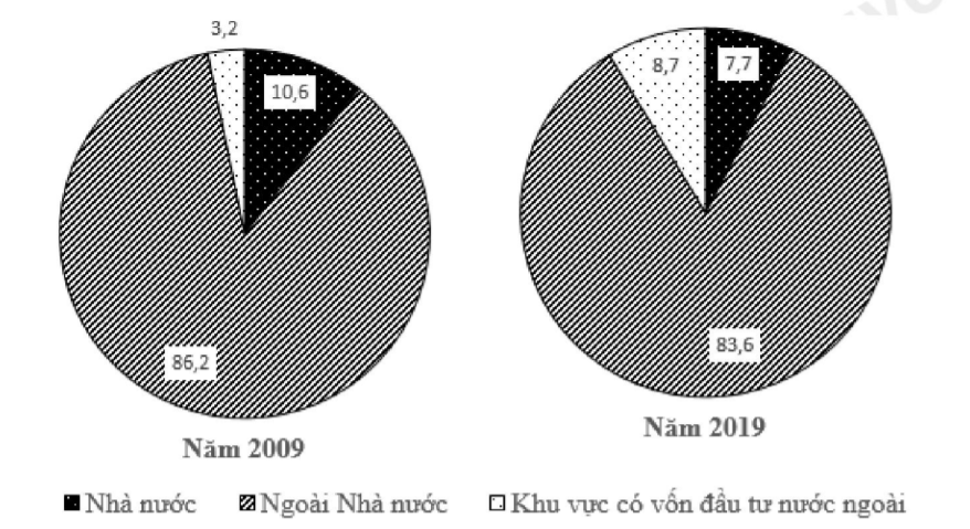 Theo biểu đồ, nhận xét nào sau đây đúng với cơ cấu lao động phân theo thành phần kinh tế nước ta năm 2019 so với 2009?