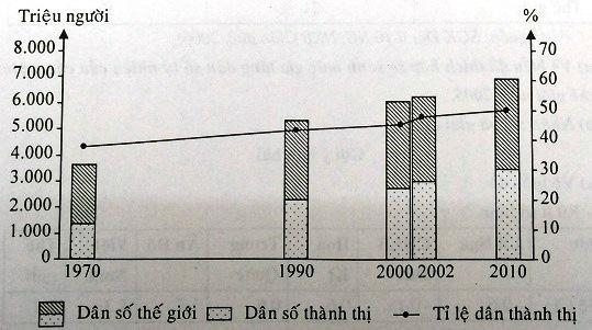 Câu hỏi: Cho biểu đồ đồ dấn số thế giới, dân số thành thị và tỉ lệ dân thành thị của thể giới giai đoạn 1970-2010