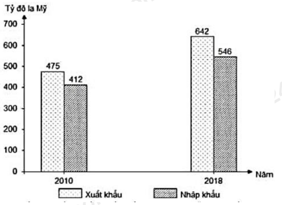 Theo biếu đồ, nhận xét nào sau đây đúng về sự thay đổi giá trị xuất, nhập khẩu năm 2018 so với năm 2010 củaXin-ga-po?