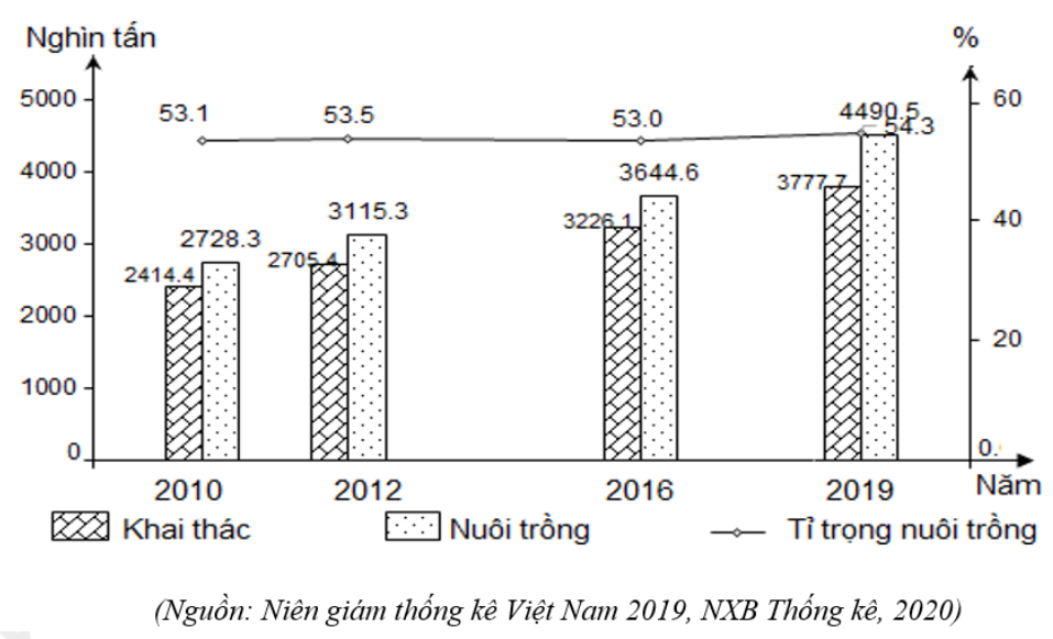 Căn cứ vào biểu đồ đã cho, nhận xét thấy giai đoạn 2010-2019, tỉ trọng sản lượng thủy sản nuôi trồng tuy còn biến động nhưng chiếm tỷ trọng cao hơn khai thác và có xu hướng tăng