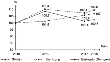 Câu hỏi: Cho biểu đồ số dân, sản lượng và bình quân lương thực đầu người của nước ta, giai đoạn 2010 - 2018: