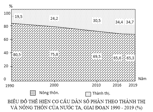 Câu hỏi: Cho biểu đồ về dân số thành thị và nông thôn nước ta giai đoạn 1990 – 2019: