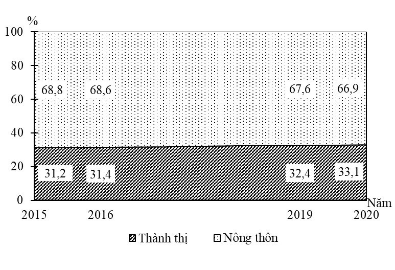Câu hỏi: Cho biểu đồ về lao động từ 15 tuổi trở lên phân theo thành thị và nông thôn của nước ta, giai đoạn 2015 - 2020: