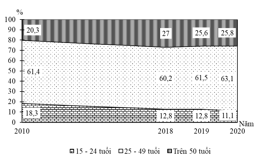 Câu hỏi: Cho biểu đồ về lực lượng lao động phân theo nhóm tuổi của nước ta, giai đoạn 2010 - 2020: