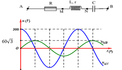 Đặt vào hai đầu mạch một điện áp xoay chiều $u=U \sqrt{2} \cos (100 \pi t+\varphi)(V)$. Đồ thị biểu diễn sự phụ thuộc của điện áp tức thời giữa hai điểm $\mathrm{A}, \mathrm{N}\left(\mathrm{u}_{\mathrm{AN}}\right)$ và giữa hai điểm $\mathrm{M}, \mathrm{B}\left(\mathrm{u}_{\mathrm{MB}}\right)$ theo thời gian được biểu diễn như hình vẽ. Hệ số công suất của đoạn mạch $\mathrm{AB}$ có giá trị gần giá trị nào nhất sau đây?