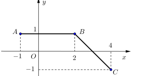 Khi đó $I=\int\limits_{-1}^{4}{f\left( x \right)}dx=\int\limits_{-1}^{2}{1.}dx+\int\limits_{2}^{4}{\left( -x+3 \right)}dx=3$.