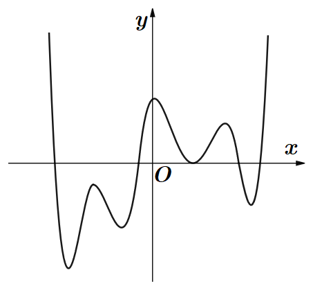 Câu hỏi: Cho hàm số $y=f\left( x \right)$ xác định, liên tục trên $\mathbb{R}$ và có đồ thị như hình vẽ (chỉ cắt trục hoành tại $5$ điểm phân biệt và có $7$ điểm cực trị).