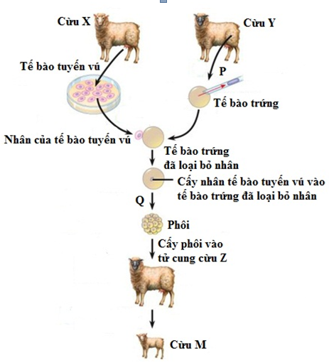 III. đúng. Không xảy ra thụ tinh trong quá trình tạo cừu M vì không xảy ra sự kết hợp giữa trứng và tinh trùng; nhân tế bào tuyến vú của cừu X có bộ nhiễm sắc thể lưỡng bội (2n).