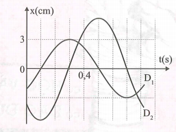 Quan sát đồ thị ta thấy thời gian dao động từ ${{D}_{2}}$ đi từ vị trí cân bằng ra biên mất thời gian là 2 ô nên: $\Delta t=2.0,1=0,2=\dfrac{T}{4}\Rightarrow T=0,8\left( s \right)\Rightarrow \omega =2,5\pi \left( \text{rad/s} \right)$.