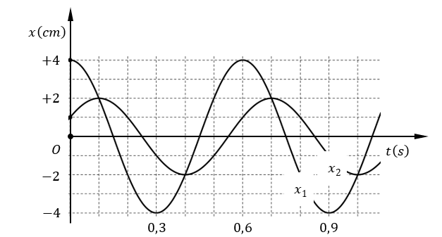 Câu hỏi: Dao động của một vật có khối lượng $m=100 \mathrm{~g}$ là tổng hợp của hai dao động điều hòa cùng phương, cùng tần số, có li độ lần lượt là $x_1$ và $x_2$. Hình bên là đồ thị biểu diễn sự phụ thuộc của $x_1$ và $x_2$ theo thời gian. Lấy $\pi^2=10$.