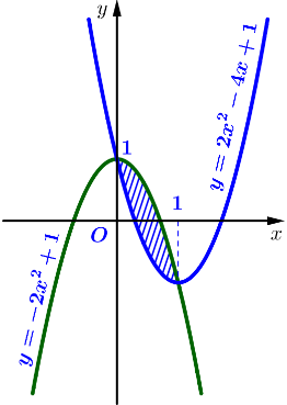 Nên diện tích cần tính là: ${S=\int\limits_{0}^{1}{\left| \left( 2{{x}^{2}}-4x+1 \right)-\left( -2{{x}^{2}}+1 \right) \right|}\text{d}x}$ ${=\int\limits_{0}^{1}{\left| 4{{x}^{2}}-4x \right|}\text{d}x}$ ${=\int\limits_{0}^{1}{\left( 4x-4{{x}^{2}} \right)}\text{d}x}$.