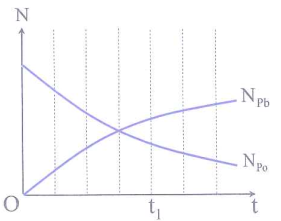 Câu hỏi: Đồng vị $^{210}Po$ phóng xạ anpha và biến thành hạt nhân chì $^{206}Pb$ bền. Hình bên là đồ thị biểu diễn sự thay đổi số hạt nhân Poloni $\left( {{N}_{Po}} \right)$ và số hạt nhân chì $\left( {{N}_{Pb}} \right)$ theo thời gian t. Lấy khối lượng nguyên tử bằng số khối, tỉ số khối lượng của hạt nhân chì so với hạt nhân Poloni vào thời điểm ${{t}_{2}}=3{{t}_{1}}$ có giá trị gần nhất với giá trị nào sau đây?