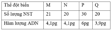 Câu hỏi: Giả sử một quần thể ở 1 loài thực vật có 4 thể đột biến NST được kí hiệu là M, N, P và Q. Số lượng NST và hàm lượng ADN có trong nhân của tế bào sinh dưỡng ở 4 thể đột biến này như bảng