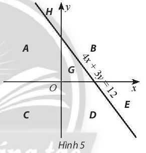 Câu hỏi: Đường thẳng \(4x + 3y = 12\) và hai trục tọa độ chia mặt phẳng Oxy thành các miền như hình 5. Hãy tìm hệ bất phương trình có miền nghiệm là miền B (kể cả bờ)