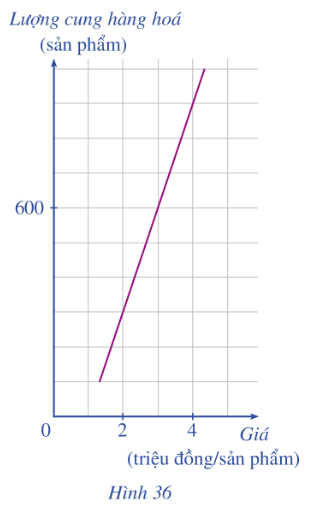 Đồ thị ở Hình 36 cho thấy sự phụ thuộc của lượng hàng hoá được sản xuất (cung) (đơn vị; sản phẩm) bởi giá bán (đơn vị: triệu đồng/sản phẩm) đối với một loại hàng hoá.
