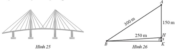 Tại trụ cao nhất, khoảng cách từ đỉnh trụ (vị trí A) tới chân trụ trên mặt cầu (vị trí H) là 150 m, độ dài dây văng dài nhất nối từ đỉnh trụ xuống mặt cầu (vị trí B) là 300 m, khoảng cách từ chân dây văng dài nhất tới chân trụ trên mặt cầu là 250 m (Hình 26). Tính độ dốc của cầu qua trụ nói trên (làm tròn kết quả đến hàng phần mười theo đơn vị độ).