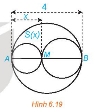 Câu hỏi: Xét đường tròn đường kính AB=4 và một điểm M di chuyển trên đoạn AB, đặt AM=x (H.6.19). Xét hai đường tròn đường kính AM và MB. Kí hiệu S(x) là diện tích phần hình phằng nằm trong hình tròn lớn và nằm ngoài hai hình tròn nhỏ. Xác định các giá trị của x để diện tích S(x) không vượt quá một nửa tổng diện tích hai hình tròn nhỏ