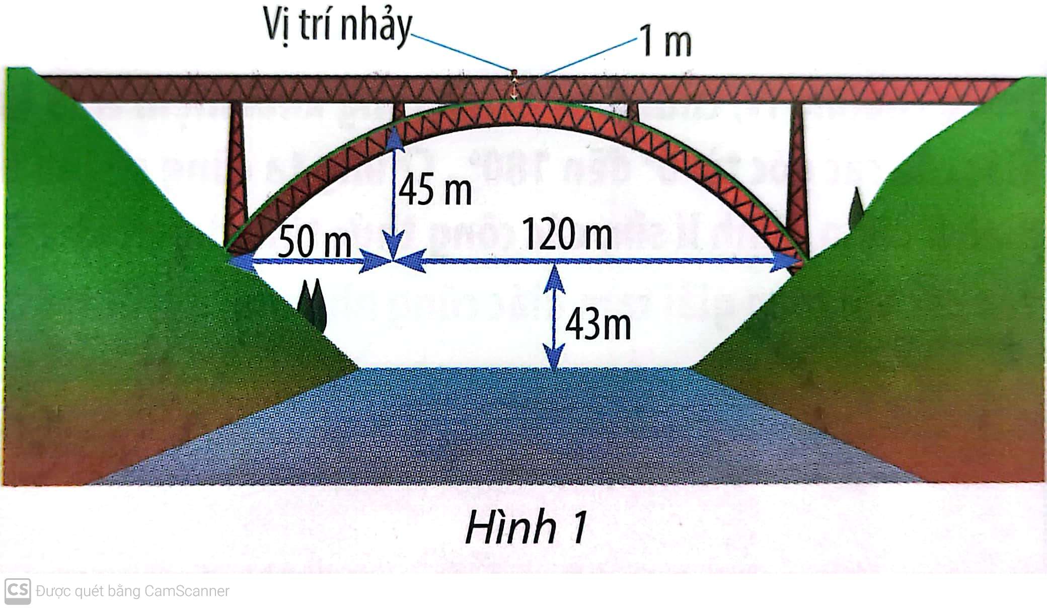 Câu hỏi: Nhảy bungee là một trò chơi mạo hiểm. Trong trò chơi này, người chơi đứng ở vị trí trên cao, thắt dây an toàn và nhảy xuống. Sợi dây này có tính đàn hồi và được tính toán chiều dài để nó kéo người chơi lại khi gần chạm đất (hoặc mặt nước). Chiếc cầu trong Hình 1 có bộ phận chống đỡ dạng parabol. Một người muốn thực hiện một cú nhày bungee từ giữa cầu xuống với dây an toàn. Người này cần trang bị sợi dây an toàn dài bao nhiêu mét? Biết rằng chiều dài của sợi dây đó bằng một phần ba khoảng cách từ vị trí bắt đầu nhảy đến mặt nước.