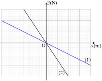 Câu hỏi: Hai con lắc lò xo dao dộng điều hòa cùng phương, dọc theo trục Ox. Đồ thị biểu diễn lực phục hồi $F$ phụ thuộc vào li độ $x$ của hai con lắc lò xo tương ứng với đường (1) và đường (2).