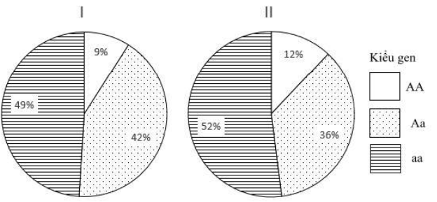 Câu hỏi: Hình bên thể hiện tỉ lệ các loại kiểu gen qui định màu lông của 2 quần thể động vật thuộc cùng một loài, alen A qui định lông trắng trội hoàn toàn so với alen a qui định lông đen, gen nằm trên nhiễm sắc thể thường. Có bao nhiêu phát biểu sau đây đúng?