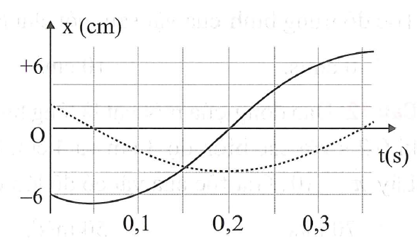 Thành phần dao động ứng với đường nét đứt. Tại $t=\dfrac{T}{12}=0,05 s$ đồ thị đi qua vị trí $x=-A\Rightarrow $ tại $t=0$ thành phần dao động này đi qua vị trí $x=-\dfrac{A\sqrt{3}}{2}=-6cm\Rightarrow A=4\sqrt{3}cm.$