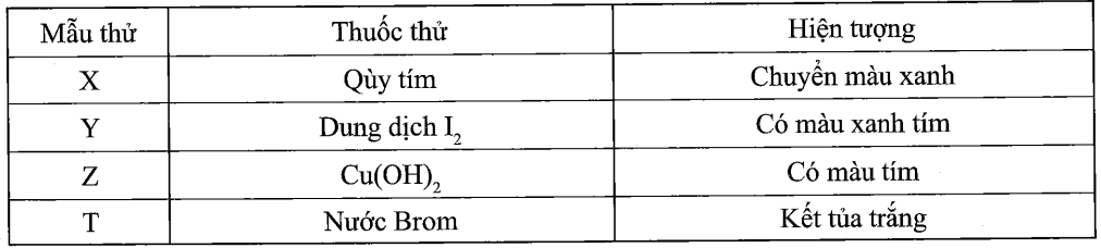 Câu hỏi: Kết quả thí nghiệm của các dung dịch X, Y, Z, T với thuốc thử được ghi ở bảng sau: