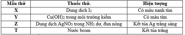 Câu hỏi: Kết quả thí nghiệm của các dung dịch X, Y, Z, T với thuốc thử được ghi ở bảng sau: