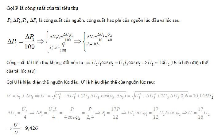 Mạch điện gồm tải $Z_{2}$ mắc nối tiếp với một điện trở $R$ rồi nới với một nguồn xoay chiều có điện áp hiệu dụng là $U_{1}$. Khi đó điện áp trên tải là $U_{2}$, và hệ số công suất $\cos \varphi _{2}=0,6$; độ giảm đện áp trên $R$ là $\Delta U=\dfrac{U_{2}}{4}$; hệ số công suất toàn mạch là $\cos \varphi _{1}=0,8$. Bằng cách điều chỉnh $Z_{2}$ và điện áp hiệu dụng nguồn, người ta làm cho công suất tiêu thụ trên $R$ giảm đi $100$ lần còn công suất $P_{2}$ và hệ số công suất $\cos \varphi _{2}$ không đổi. Khi đó điện áp hiệu dụng đầu nguồn phải tăng