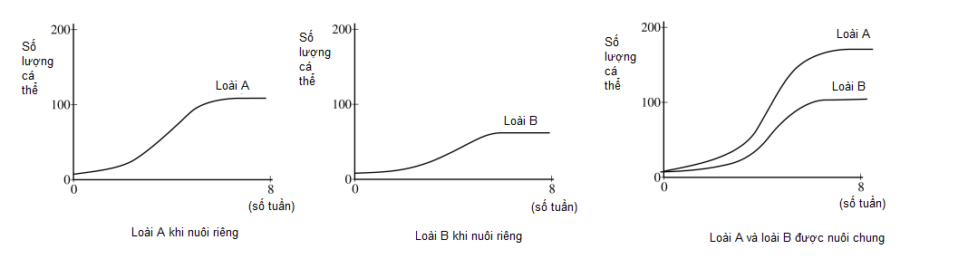 Câu hỏi: Khi nghiên cứu mối quan hệ sinh thái giữa 2 loài vi sinh vật (A và B), người ta đã nuôi trong cùng một điều kiện môi trường: Loài A và B được nuôi riêng và nuôi chung. Kết quả khảo sát số lượng cá thể ở mỗi trường hợp được minh họa bằng sơ đồ bên dưới. Trong số các nhận xét sau, có bao nhiêu nhận xét đúng?