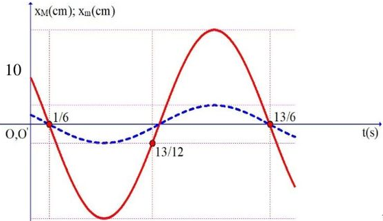 Tại $\mathrm{t}=\dfrac{13}{12} \mathrm{~s}$ thì $-\mathrm{A}_{\mathrm{M}}=20 \cos \left(\pi \cdot \dfrac{13}{12}+\dfrac{\pi}{3}\right) \Rightarrow A_M=5 \sqrt{6}-5 \sqrt{2} \mathrm{~cm}$.