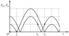 Câu hỏi: Một con lắc lò xo treo thẳng đứng, dao động điều hòa tại nơi có $g=10m\text{/}{{s}^{2}}$ và khối lượng vật $m=100g.$ Hình bên là đồ thị biểu diễn sự phụ thuộc của độ lớn lực kéo về Fkv tác dụng lên vật và độ lớn lực đàn hồi Fdh của lò xo theo thời gian t. Biết ${{t}_{2}}-{{t}_{1}}=\dfrac{\pi }{20}s.$ Động năng của vật tại thời điểm $t={{t}_{3}}$ gần nhất giá trị nào sau đây?