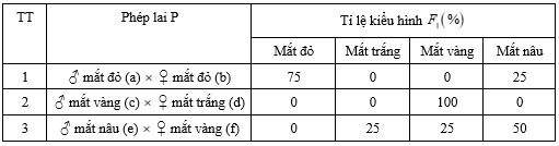 Phép lai 3: ♂ mắt nâu (e) $\times $ ♀ mắt vàng (f) $\to $ 1 trắng :1 vàng: 2 nâu $\to $ nâu >> vàng >> trắng.