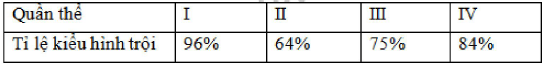 Câu hỏi: Một loài sinh vật ngẫu phối, xét một gen có hai alen nằm trên nhiễm sắc thể thường, alen A trội hoàn toàn so với alen a. Bốn quần thể của loài này đều đang ở trạng thái cân bằng di truyền và có tỉ lệ các cá thể mang kiểu hình trội như sau: