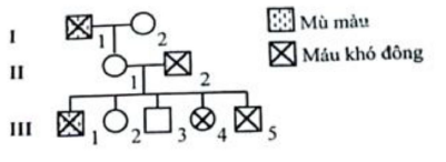 Câu hỏi: Ở người, bệnh mù màu đỏ - lục và bệnh máu khó đông do hai gen lặn nằm trên nhiễm sắc thể X quy định, cách nhau 15 cm. Theo sơ đồ phả hệ bên, có bao nhiêu phát biểu sau đây đúng?