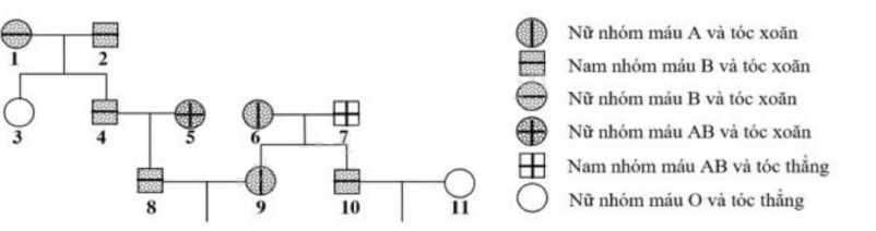 Câu hỏi: Ở người, gen quy định nhóm máu và gen quy định dạng tóc đều nằm trên nhiễm sắc thể thường và phân li độc lập. Theo dõi sự di truyền của hai gen này ở một dòng họ, người ta vẽ được phả hệ sau: