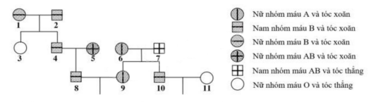 4. sai, cặp vợ chồng 10 – 11: $\text{Hh}{{\text{I}}^{\text{B}}}{{\text{I}}^{\text{O}}}\times \text{hh}{{\text{I}}^{\text{O}}}{{\text{I}}^{\text{O}}}$ → XS sinh con tóc thẳng và có nhóm máu O là 1/2 x 1/2 =1/4