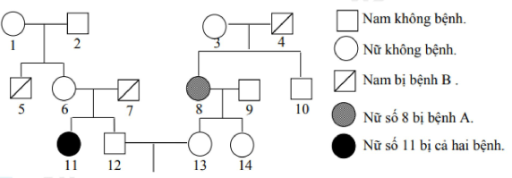 Câu hỏi: Phả hệ ở hình dưới đây mô tả sự di truyền 2 bệnh ở người: Bệnh A do một trong hai alen của một gen quy định; bệnh B do một trong hai alen của một gen nằm ở vùng không tương đồng trên nhiễm sắc thể giới tính X quy định. Biết rằng không xảy ra đột biến. Theo lí thuyết, có bao nhiêu phát biểu sau đây đúng?