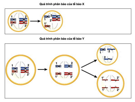 (1). Tế bào X bị rối loạn giảm phân II và tế bào Y bị rối loạn giảm phân I.