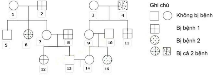 Câu hỏi: Sơ đồ phả hệ dưới đây mô tả hai bệnh di truyền ở người. Biết rằng mỗi bệnh do một gen có 2 alen quy định, trong đó có một bệnh do gen nằm trên vùng không tương đồng của nhiễm sắc thể X quy định và cả hai bệnh đều đang ở trạng thái cân bằng di truyền, trong đó tần số alen lặn của bệnh 2 là
