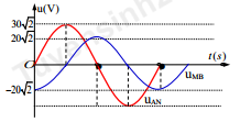 Nhìn vào đồ thị ta thấy, ${{U}_{AN}},{{U}_{MB}}$ vuông pha vì: ${{U}_{AN}}$ cực đại thì UMB​ cực tiểu và ngược lại.